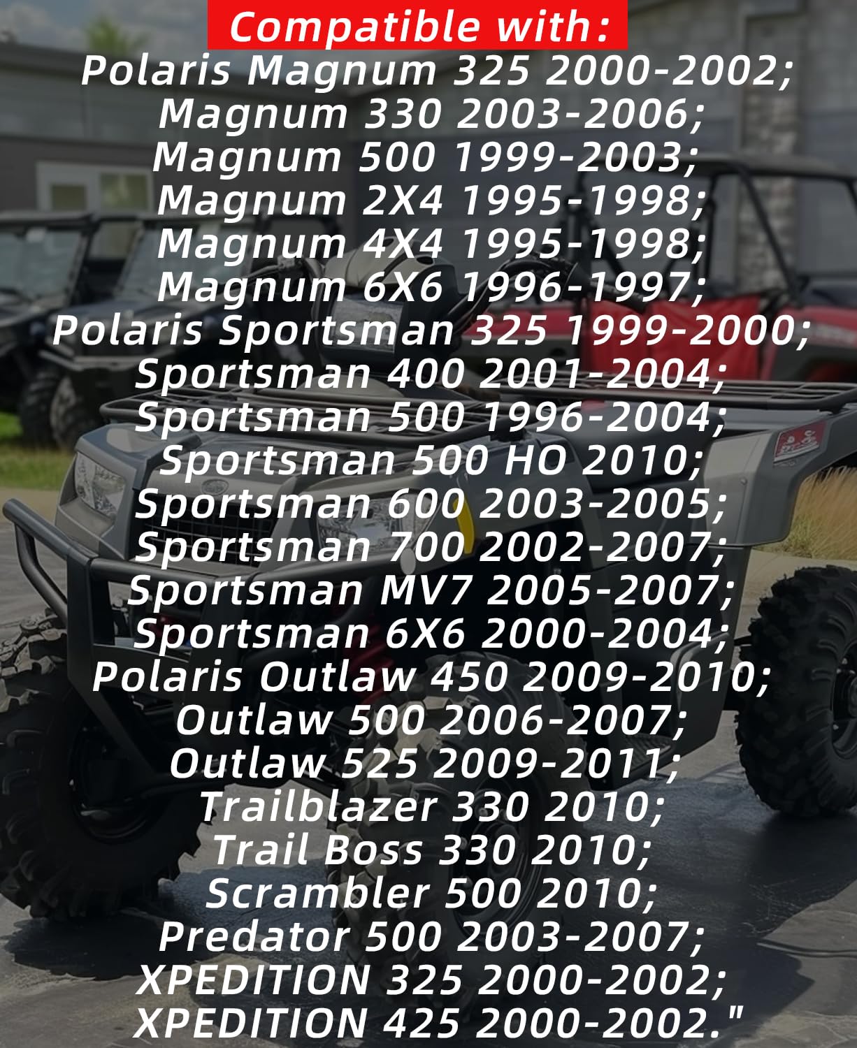- Fitment: Compatible with Polaris Magnum 325 2000-2002; compatible with Magnum 330 2003-2006; compatible with Magnum 500 1999-2003; compatible with Magnum 2X4 1995-1998; compatible with Magnum 4X4 1995-1998; compatible with Magnum 6X6 1996-1997. Compatible with Polaris Sportsman 325 1999-2000; compatible with Sportsman 400 2001-2004; compatible with Sportsman 400 2001-2004; compatible with Sportsman 500 1996-2004; compatible with Sportsman 500 HO 2010; compatible with Sportsman 600 2003-2005.